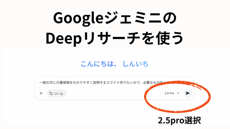 - Geminiに依頼する: まず、Geminiに「一般の方に介護保険をわかりやすく説明するスライド作りたい」 といった形で、目的を伝えます。
