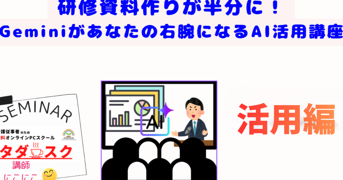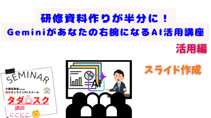 こんにちは!オンラインPCスクール「タダスク」で講師を務めております 。介護従事者の方をはじめ 、多くの受講生から「研修資料やスライドの作成に時間がかかりすぎる」というお悩みを伺います。